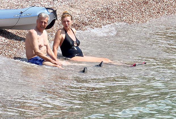 Čim su se smestili, pevač je euforično uleteo u vodu i pokazao da uprkos godinama ima dobru kondiciju i vitku liniju, a za njim je krenula i supruga, koja se skinula u jednodelni kupaći kostim. Poput zaljubljenih tinejdžera, oni su se sve vreme držali za ruke, mazili se i uživali u plićaku, kao da su na početku veze.
