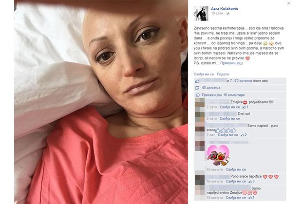 "Završeno sedma hemoterapija. Sad ide ona Halidova "Ne zovi me, ne traži me, uzela si sve" jedno sedam dana... a onda počinju i moje velike pripreme za koncert. Od laganog treninga, pa dalje i hvala na podršci svih ovih godina, a naročito svih ovih bolnih meseci. Naravno, ima još meseci da se izdrži, ali nadam se ne previše", napisala je pevačica na Fejsbuku.