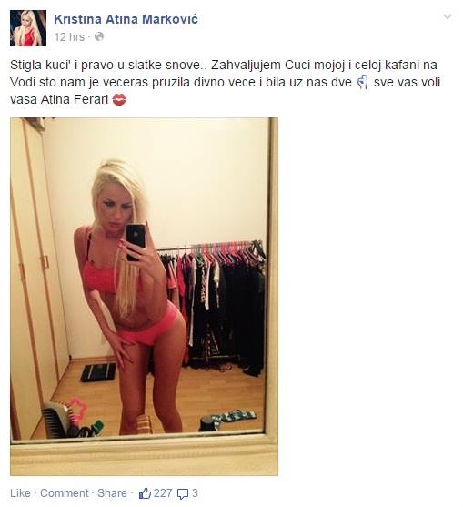 Atina je nakon žurke počastila svoje pratioce na društvenoj mreži selfijem u gaćicama i brusu, napisavši da joj je sa Cucom bilo "mega". Ali, to nije sve, starleta je ujutru okačila nove fotke, na kojima se vidi da je u istom vešu.