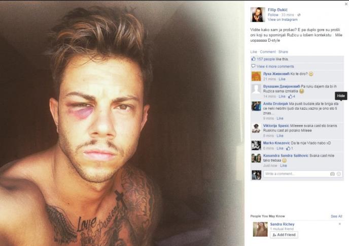 "Vidite kako sam ja prošao? E pa duplo gore su prošli oni koji su spominjali Ružicu u lošem kontekstu", napisao je Filip sa sve modricom koja mu je ostala od sinoć nakon tuče.