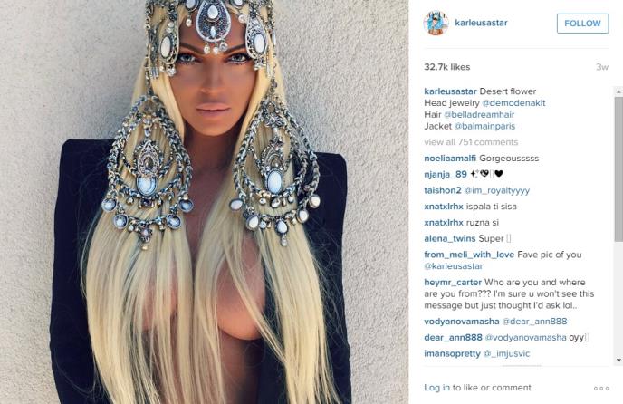 Imala je na sebi minijaturne gaćice i korset. Jedina stvar koja je spasla od verovatne zabrane na Instagramu je veliki plišani medved koji joj je pokrio bradavicu sa jedne strane, a duga kosa sa druge