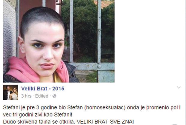 - Stefani je pre tri godine bio Stefan (homoseksualac), onda je promenio pol i već tri godine živi kao Stefani. Dugo skrivena tajna se otkrila, Veliki brat sve zna - stoji ispod fotografije na fan stranici pomenutog rijalitija na Fejsbuku.