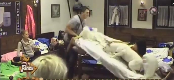Kristijan Golubović napao je sinoć silikonsku kraljicu Tijanu Đuričić dok je ležala na krevetu sa svoji psom Donom. Golubović, iznerviran jer mu silikonska kraljica otkako je ušla na imanje neprestano spominje ženu, digao krevet na kojem se nalazila zajedno sa psom i prevrnuo je.