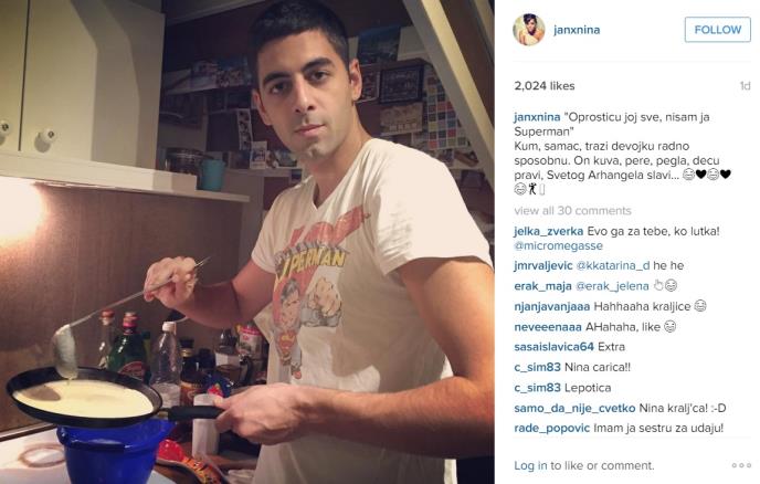 "Oprostiću joj sve, nisam ja Supermen". Kum, samac, traži devojku, radno sposobnu. On kuva, pere, pegla, decu pravi, Svetog Arhangela slavi...", napisala je Nina.