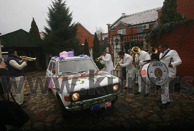 Dok su trubači grmeli uz pesmu Đurđevdan, mladenci su se pozdravljali iz automobila sa novinarima i fotoreporterima.