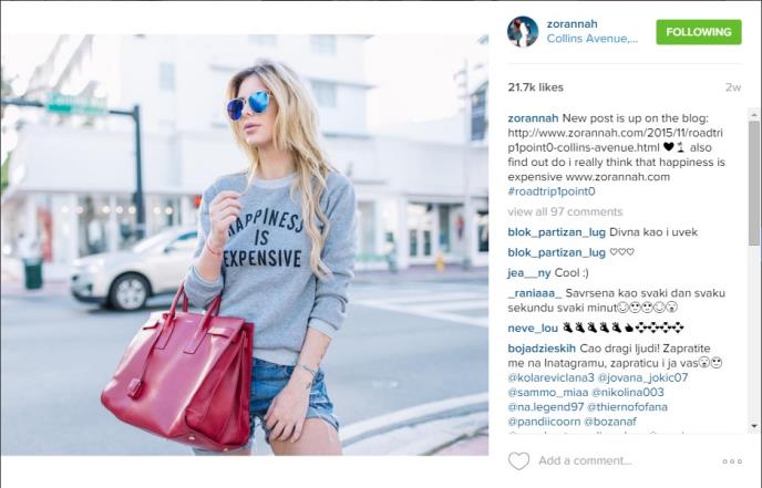 "Ja sam srećna ćerka jer sam imala svoju majku 25 godina i svog oca 20. Ova slika je nastala baš u ovom gradu, pre više od 7 godina. Tada sam bila jako bezbrizna i glupa. Živela sam u svom balonu za koji nisam znala da može da eksplodira i da će eksplodirati samo 2 godine kasnije. Ali pucanja se ne treba plašiti, ono izvuče najbolje iz vas. Danas, 7 godina kasnije, šetam sama tom istom Petom Avenijom kojom sam mlatila maminom karticom misleći kako nikada neću morati da imam svoju jer bože moj šta će mi kad imam njenu, trošim svoje pare koje sam sama zaradila i sećam se koliko me je jako grlila i volela. I dalje me voli i čuva, to što fizički više nije ovde ne znači da je nema. I to što ja ne pričam o njoj javno ne znači da je volim manje i da mi ne nedostaje. Samo smatram da nemam prava da kukam jer imam divan život zahvaljujući mojim roditeljima koji su mi pokazali kako dobar život izgleda i naučili da moram da radim za njega. I ne ovo nije bila najgora godina u mom životu, čak šta više bila je jedna od najboljih kada sam konačno shvatila ko sam i šta sam i šta želim."