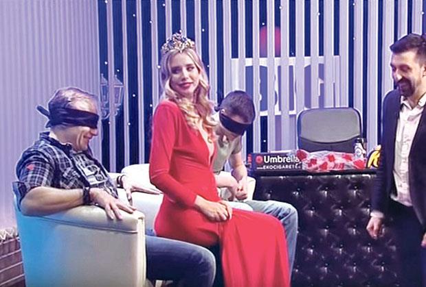Voditelj Ognjen Amidžić stavio je Kaliniću i drugom gostu Vuku Kostiću crni povez preko očiju i pozvao atraktivnu devojku da im sedne u krilo kako bi oni procenili njenu kilažu. - Da provalimo kakvi ste muškarci! Imamo jednu divnu devojku pred vama, koja je iz publike. Na vama je da u tri naredna koraka opišete kako ona izgleda. Morate da pogodite koliko otprilike ima kilograma - rekao je Ognjen.