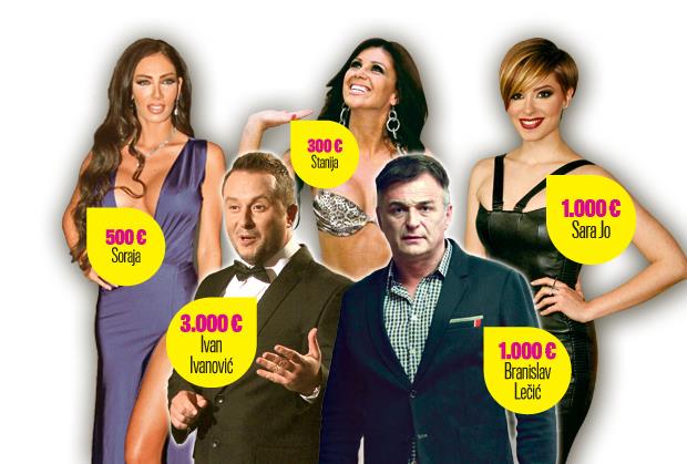 Kako saznajemo, pojedinci za svoje pojavljivanje traže i nekoliko hiljada evra, ali samo retki toliko uspeju i da dobiju, kao što je slučaj s voditeljem televizije Prva Ivanom Ivanovićem, koji je prošle godine na jednoj privatnoj zabavi uzeo 3.000 evra za vođenje programa. Njegova koleginica i prijateljica Marija Kilibarda dolazak najčešće naplaćuje 500 evra.