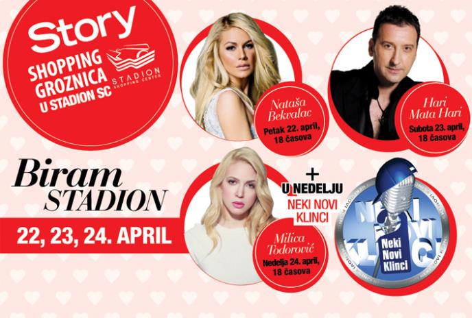 Nataša Bekvalac, Hari Mata Hari i Milica Todorović pevaju za vas u Stadion Shopping centru 22, 23. i 24. aprila. Povodom trećeg rođendana centra, magazin Story organizuje Veliku šoping groznicu tokom koje će radnje davati do čak 70 odsto popusta.
