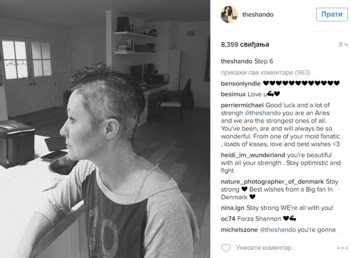 Šenon je nedavno oduševila svet kada je zabeležila momenat brijanja glave i postavila fotografije na popularnu društvenu mrežu Instagram, a podrške su joj dale kolege iz serije Beverli Hils, Ian Ziring i Džejson Prisli, koji veruju da će Šenon pobediti opaku bolest.
