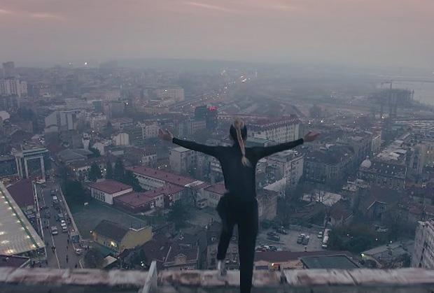 Tokom jedne od njih zgodna umetnica visi na rubu solitera zakačena sajlama a nagib njenog tela asocira na pokušaj samoubistva.