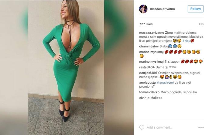 Maca je izjavila da ne voli plastične operacije, iako je sama ugradila silikone u grudi, a razlog za to je da joj bolje stoje elegantne haljine.