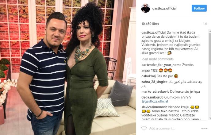 "Da mi je neko ikada pričao da ću da doživim i to da budem zajedno gost u emisiji sa Lidijom Vukićević, jednom od najlepših glumica našeg regiona, ne bih mu verovao! Ali slika govori sve", napisao je Gastoz sa oduševljenjem ma Imstagramu, dok su se njegovi pratioci u poptunosti složili sa njim komentarišući da se Lidija Vukićević ne menja i da prelepo izgleda.