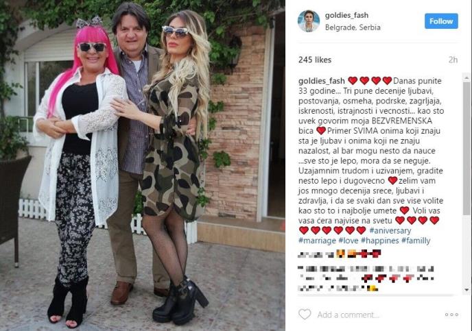 "Danas punite 33 godine... Tri pune decenije ljubavi, poštovanja, osmeha, podrške, zagrljaja, iskrenosti, istrajnosti i večnosti... Kao što uvek govorim moja bezvremenska bića. Primer svima onima koji znaju šta je ljubav i onima koji ne znaju nažalost, ali bar mogu nešto da nauče. Sve što je lepo, mora da se neguje. Uzajamnim trudom i uživanjem, gradite nešto lepo i dugovečno. Želim vam josš mnogo decenija sreće, ljubavi i zdravlja, i da se svaki dan sve više volite kao što to i najbolje umete. Voli vas vaša ćera najviše na svetu", napisala je ona.
