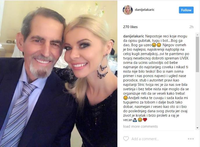 "Ne postoje reči koje mogu da opišu gubitak, tugu i bol....Bog ga dao, Bog ga uzeo. Njegov osmeh je bio najlepši, najiskreniji najtopliji na celoj kugli zemaljskoj...svi te pamtimo po tvojoj nesebičnoj dobroti spreman uvek svima da učiniš udovoljiš od bebe najmanje do najstarijeg čoveka i nikad ti ništa nije bilo teško! Bio si nam svima primer i naš ponos najveći i ugled naše porodice, stub i autoritet pravi kao najstariji Tvoja reč je za nas sve bila svetinja i bez tebe ništa nije moglo da se organizuje niti da se veseli kako treba! Anđeli neka te čuvaju i sada kada mi tugujemo za tobom i dalje budi tako dobar, nasmejan i veseo kao što si i bio do poslednjeg dana svog života jer ovaj život je kratak i brzo proleti, a raj je večan", napisala je Danijela uz zajedničku fotografiju.