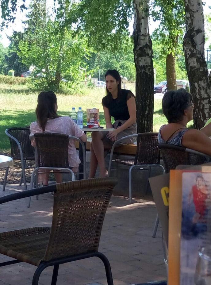 Opuštena, u šortsu i majici ćaskala je sa prijateljicom, dok se Teo znojio na terenu.