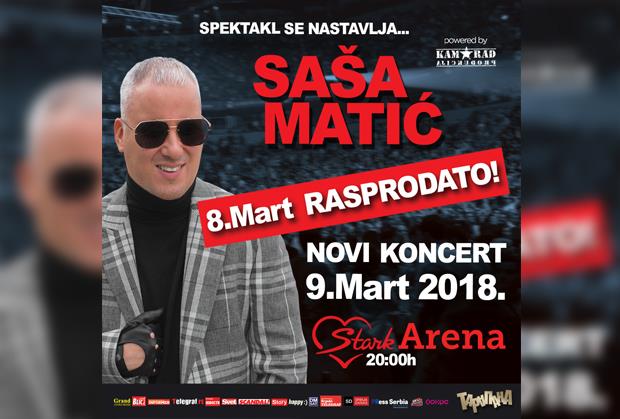 Najpopularniji pevač današnjice, Saša Matić, može već sada da se pohvali rasprodatom Štark Arenom za Dan Žena. Nešto više od mesec dana pre samog koncerta, pevač je odlučio da svojoj publici ulepša još jedan dan i priredi im jos jedan spektakl za pamćenje.