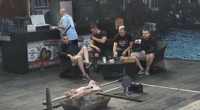 Učesnici rijalitija od ranog jutra se spremaju kaki bi proslavili praznik, te u dvorištu peku prase.