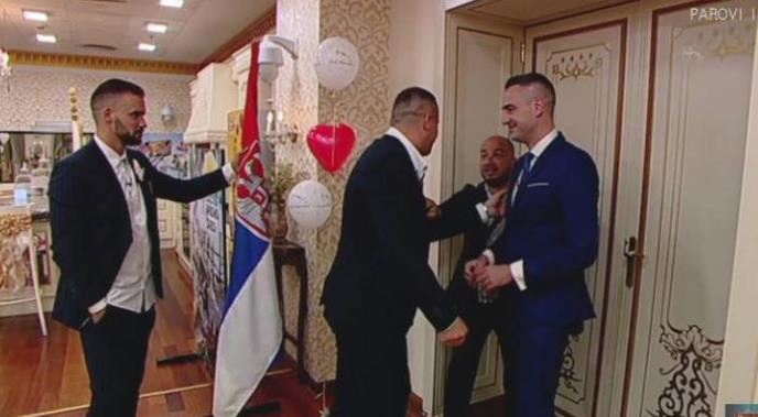 Učesnici rijalitija "Parovi" Mladen Vuletić i Nina Prlja, venčaće se danas, a tokom svadbenog veselja Marko Perović i Tihomir Filipović su krenuli ka vratima i pokušali da provale i uđu.