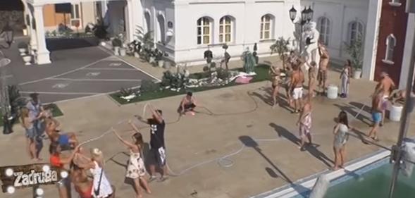 "Dragi zadrugari, sada ćete se podeliti u dve grupe tako što će Sloba izvlačiti papiriće. Igra počinje pred bazena. Jedan iz grupe mora rukama vaditi vodu iz bureta i sipati u levak koji drži drugi takmičar. Taj takmičar presipa vodu iz tog levka u drugi levak koji drži treći takmičar. Treći takmičar drži i crevo u koje sipa vodu iz tog levka. Voda iz levka i creva curi u činiju koju jedan iz grupe drži na glavi. Taj koji drži činiju na glavi sedi na stolici koja je postavljena pored bazena. Kada se činija napuni, taj koji je drži na glavi trči kod jezera i svu vodu presipa u kantu. Možete menjati svoje uloge u igri, a na kraju zvučnog signala će se meriti koja grupa je više vode prebacila u kanstu pored jezera", pisalo je u pismu.
