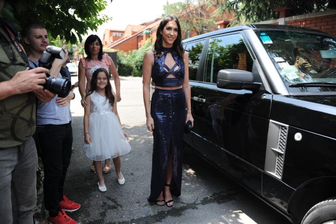 Glumica Jelisaveta Orašanin, supruga srpskog košarkaša Miloša Teodosića, mladoženinog kuma, zablistala je u teget kompletu.