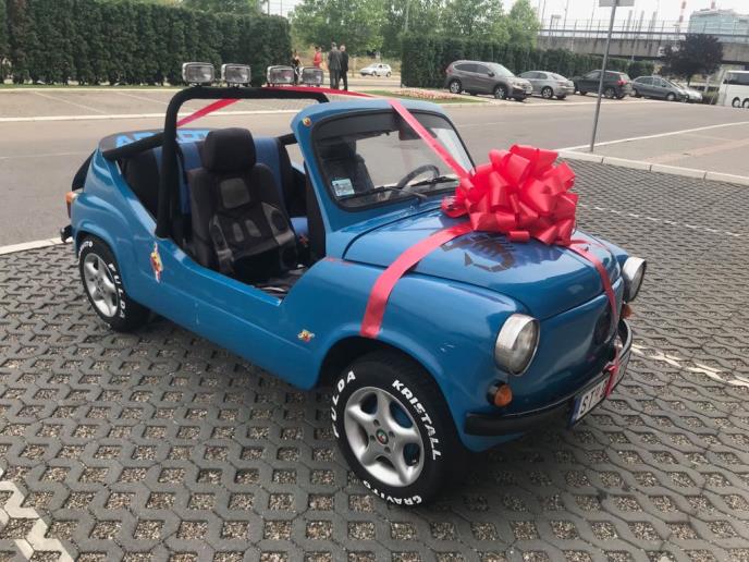 U pitanju je preslatki plavi "Fića", uvijen u ukrasnu mašnicu. On će novopečeni bračni par čekati na parkinu ispred Ekspo centra do 17h, kada je najavljen nastavak slavlja.