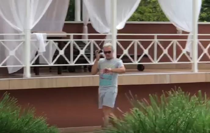 Gastozu kiša nije smetala pa je šetkao oko bazena i razgovarao telefonom. Izgleda da je ugovarao neki poslovni sastanak, budući da je sve vreme gledao u sat.