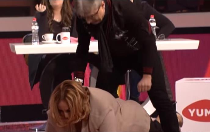 "Pa ništa, pomažem ti samo", odgovorio je poznati šoumen, koji joj je posle odrađenih 25 sklekova, pružio ruku da ustane, pa je i poljubio u emisiji "Zvezde Granda Specijal".