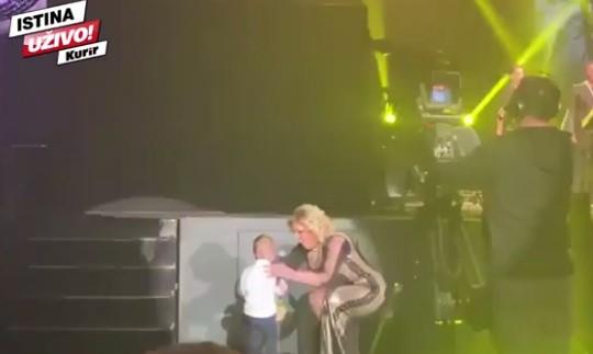 Pravi šou je usledio tek kada je najmlađi obožavalac izašao na binu i uručio pevačici poklon. Ona je "čučnula" kako bi mu bila bliže, a onda su usledile poteškoće. Pevačica je bila ograničena uskom haljinom, pa je morala da se uhvati za ivicu bine kako bi ustala.