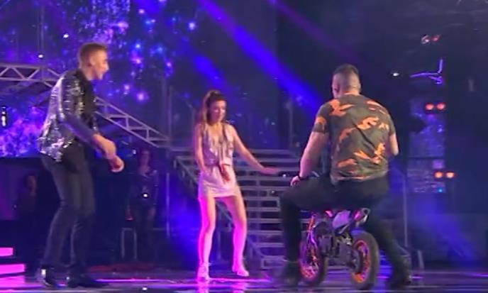 Uskoro je iz pomenutog sanduka takmičar izvukao motor, pa je pozvao Slobu da isti i provoza scenom. On je umalo "pregazio" svoju bivšu suprugu, dok je s teškom mukom upravljao dvotočkašem.