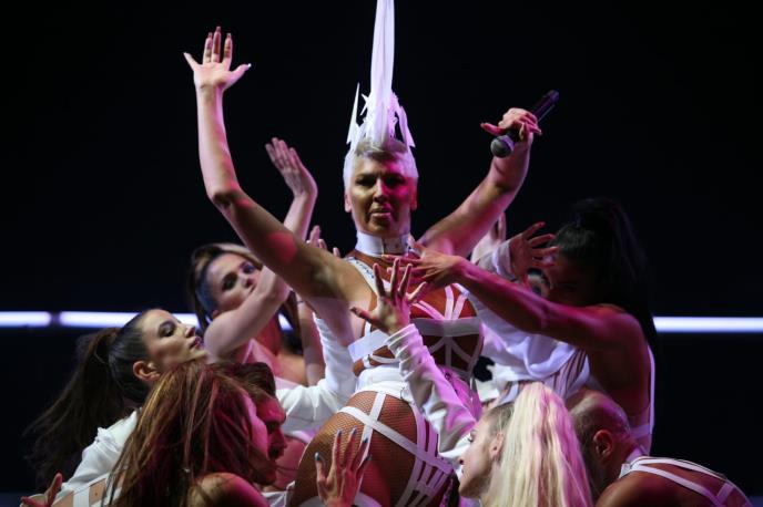 Jelena Karleuša nastupila je na festivalu Ulaz, a na scenu je izašla samo u belim tračice preko celog tela, mrežastim čarapama, a na glavi je imala veliki modni detalj, koji podseća na krestu.