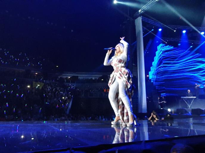 Pevačica se na bini pojavila u zanimljivoj odevnoj kombinaciji i nosila visoke potpetice.