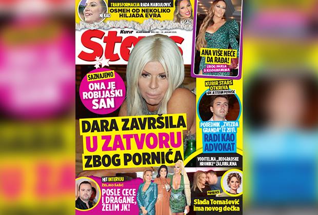 Kurir Stars ekskluzivno saznaje: Ona je robijaški san! Dara Bubamara završila u zatvoru zbog pornića. Hit intervju sa Željkom Šašićem: Posle Cece i Dragane, želim JK! Ana Nikolić više neće da rađa zbog pakla s kilogramima. Kurir Stars otkriva gde je Stefan Petrušić: Pobednik „Zvezda Granda“ iz 2011. godine radi kao advokat. Paparaco fotke - voditeljka „Beogradske hronike“ zaljubljena: Slađana Tomašević ima novog dečka. Plus transformacija Rade Manojlović: Osmeh od nekoliko hiljada evra!