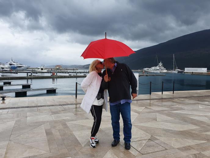 Na šetalištu u Herceg Novom, nije im smetala kišica ni tmuran dan. Pod crvenim kišobranom zagledali su se u pučinu, a onda je pao i poljubac na Dan zaljubljenih.