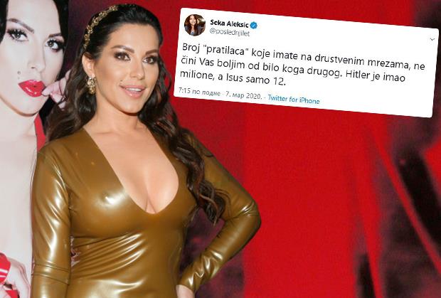 - Broj pratilaca koje imate na društvenim mrežama ne čini vas boljim od bilo koga drugog. Hitler je imao milione, a Isus samo 12 - napisala je Seka na Tviteru, gde inače ima 205.000 pratilaca, dok na Instagramu ima čak 1,2 miliona fanova.