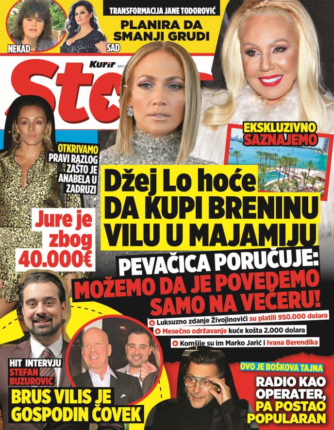 Novi Stars ekskluzivno saznaje: Džej Lo hoće da kupi Breninu vilu u Majamiju! Pevačica poručuje: Možemo da je povedemo samo na večeru. Luksuzno zdanje Živojinovići su platili 950.000 dolara, mesečno održavanje košta 2.000 dolara, komšije su im Marko Jarić i Ivana Berendika.