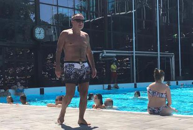 Došao je sam, bez supruge, koja se inače s njim nikada ne pojavljuje u javnosti. Više od pola sata proveo je u bazenu, naslonjen ne zid, dok je na licu imao tamne naočare da ga znatiželjni ne bi prepoznali. Nakon toga je izašao iz vode i uputio se ka ležaljkama, pa smo i mi promenili ugao za fotografisanje.