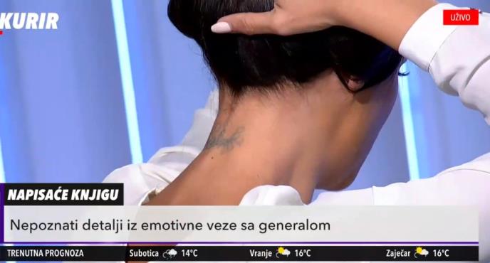 "Nemoguće je sve rešiti u kratkom roku. Ta tetovaža je stavljena na moj vrat pre 9 godinu, već je u fazi skidanja, to je sada samo fleka. Već sam uradila lasersko uklanjane, gotovo da se ne vidi. Tu su i par nekih zevzdica, kao on je general čovek, pa kao policija... Više ne obraćam pažnju ne to. Biće uklonjeno sto posto. Želim da je sklonim, da sve bude čisto. Nisam ponosna na to", poručila je ona, a potom i pokazala tetovažu.