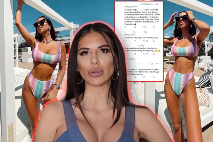 Ima i onih koji su bacili akcenat na njen kupaći i noge: - Nisam neki stručnjak, al da nije slučajno naopako obukla donji deo kupaćeg? Izgeda kao da nosi pelene. N eznam šta je ovi m htela da postigne, realno. Ne znam da li su ćorave kad rade fotošop. Totalno je preterala sa fotošopom izgleda kao balvan. Noge je unakazila da ne verujš da tako može neko sebe da povredi - žestoki su bili Tviteraši.
