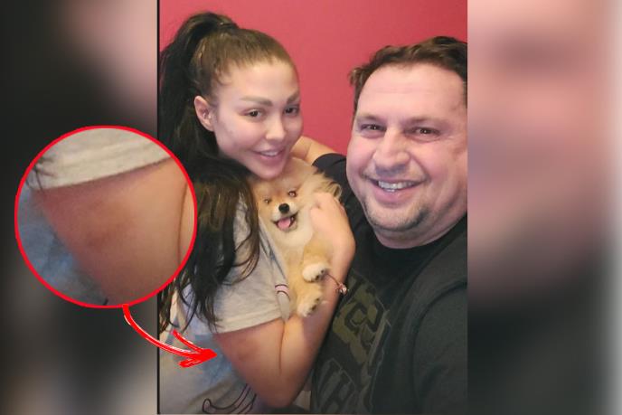 Maja ja sa svojim ljubimcem i tatom pozirala u majici kratkih rukava, te se mogu primetiti modrice i podlivi koje ima na ruci.