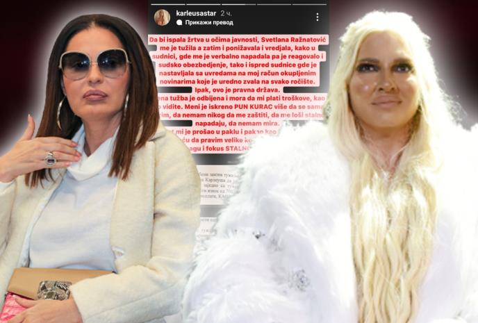 - Ipak, ovo je pravna država. Njena tužba je odbijena i mora da mi plati troškove, kao što vidite. Meni je iskreno pun k*rac više da se sama borim, da nemam nikog da me zaštiti, da me loši stalno napadaju, da nemam mira. Život mi je prošao u paklu i pakao kao što vidite ne staje. Hoću da pravim velike koncerte, albume, ne da moju snagu i fokus stalno oduzimaju ovakvi - naglasila je Jelena Karleuša uz zaključak: