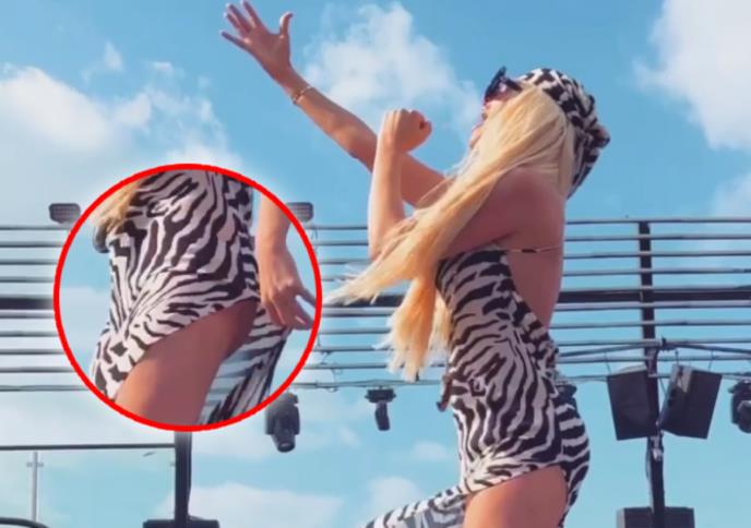 Karleuša je đuskala u laganoj letnoj haljini dubokog izreza, koja se viorila na vetru, te u jednom trenutku pored gole noge otkrila i zanosnu pozadina.
