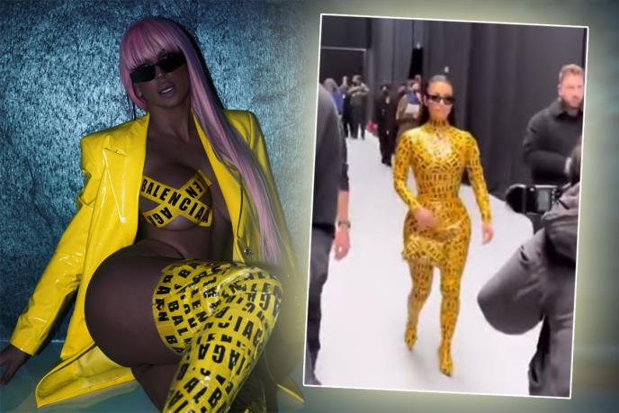 Pevačica je pozirala "obučena" u tanga gaćice i čizme koje je oblepila trakom sa imenom skupocene marke, a preko grudi je imala žutu izolir traku. Sve je uparila uz roze periku, pa su se komentari nizali. Naime, pre nekoliko dana Kim je privukla veliku pažnju kada se pojavila cela oblepljena trakom sa nazivom popularnog brenda zbog koje se jedva pomerala.