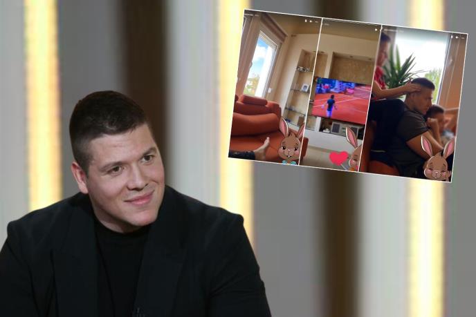 Momci su se zavalili i uživali u velikoj dnevnoj sobi, dok su ležali na komfornoj ugaonoj garnituri narandžaste boje. Jelena je snimila i druge delove ove prostorije - police sa ramovima za slike, ukrasima, a posebnu pažnju je privukao i ogroman televizor u koji su pevač i dečaci gotovo bez treptanja gledali.