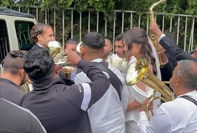 Par je na venčanje stigao u džipu, a dok je mladoženja plaćao trubačima koji su ih opkolili pred crkvom, trudna mlada je đuskala. Kako se vidi na snimku koji je objavila Maša Terzić, potom su mladenci nasmejani, držeći se za ruke otišli ka crkvi, gde su se u krugu najbliže rodbine zavetovali pred Bogom.