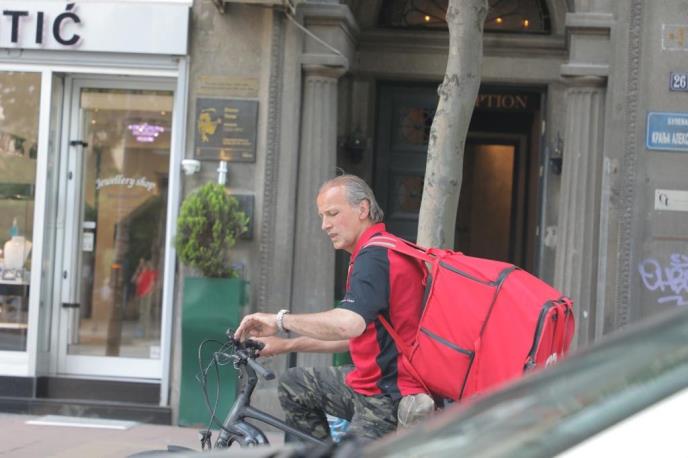 Naš paparaco uslikao je Subotića tokom jedne vožnje, kako na biciklu i s velikim rancem na leđima dostavlja hranu na više adresa na Bulevaru kralja Aleksandra.