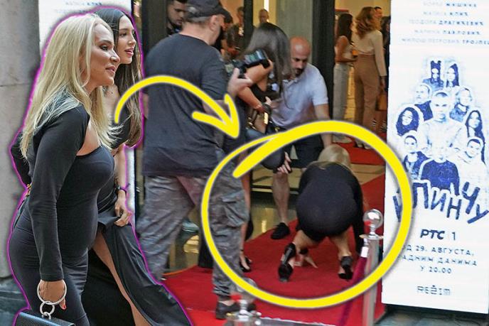 Vojaževa majka i devojka su za ovu priliku odabrale crne svečane toalete. Njih dve su se držale ruku podruku i tako pozirale okupljenim reporterima na samom ulazu u bioskopsku salu. Dok su koračale crvenim tepihom u dugačkim crnim haljinama, Žana se saplela i pala. U tom trenutku u prvi plan došla je njena zadnjica i crne tanga gaćice, koje su se ocrtavale ispod providne haljine.