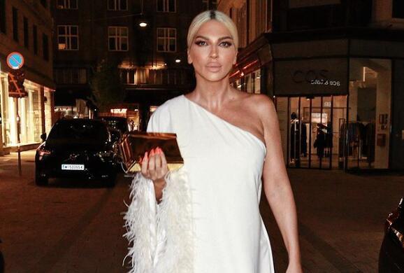 Bela, dugačka haljina na ivicama je imala perje, jedno rame je bilo golo, a njeni atributi su se diskretno ocrtvali.