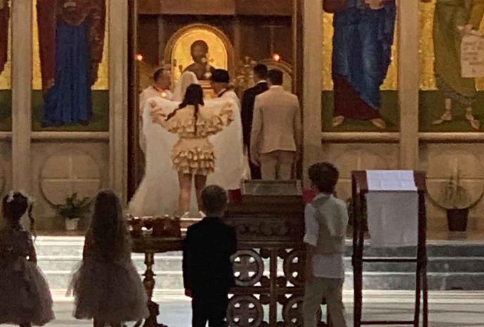 U crkvi pored mlade i mladoženje su deca Novaka i Jelene Đokovića, koji mirno gledaju kako se mladenci pred ikonostasom zaklinu na večnu ljubav.