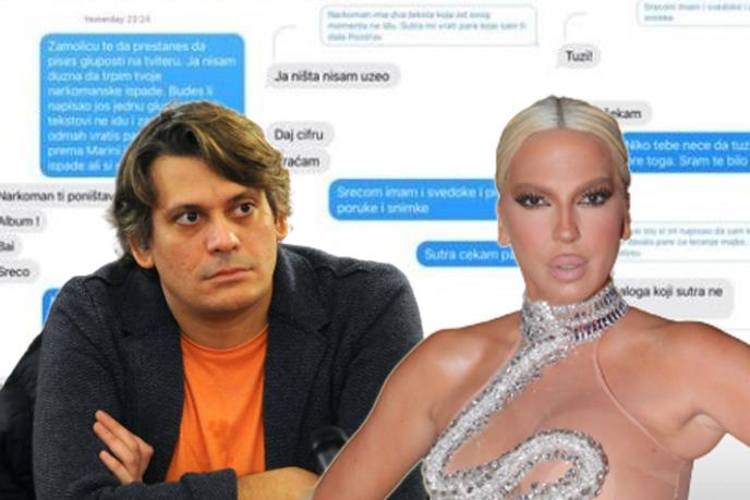 "Zamoliću te da prestaneš da pišeš gluposti na Tviteru. Ja nisam dužna da trpim tvoje narkomanske ispade. Budeš li napisao još jednu glupost, tvoji tekstovi ne idu i zamoliću te da mi odmah vratiš pare. Iz poštovanja prema Marini tolerišem tvoje ispade, ali sada si preterao", napisala je Karleuša Laći u poruci, a on odgovorio: